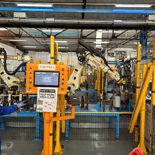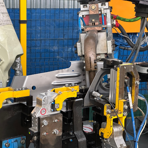Automated spot welding ensures consistent, high-quality joints for complex automotive assemblies.